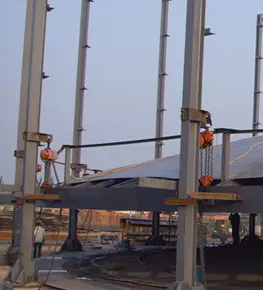 另外,倒掛葫蘆易于控制墻板的變形,保證箱體的幾何精度,從而保證了墻板的焊接質量,避免了填水,修整等工藝不利于控制變形的缺點。電動葫蘆提升和翻轉方法提高了勞動效率和設備使用效率。